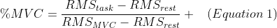 근전도 신호는 Sampling rate = 1,500Hz로 수집하였고 band pass filtering 20~450Hz 대역으로 필터링하였다. 신호 처리는 MR.3.12 (Noraxon, Arizona, U.S.A.) 프로그램을 이용하였으며 수집된 RMS 데이터는 Filtering, Rectification, Smoothing, Amplitude Normalization 순으로 신호 처리 하였다. 각 피험자의 근육에 따른 정규화를 수행하기 위해 MVC (Maximum Voluntary Contraction)를 측정하였다. 최대 근활성도는 Figure 4와 같이 각 근육에 대하여 2회 반복 측정(반복 사이 간 1분 휴식)하여 더 큰 값을 이용하였으며 휴식 시 근활성도는 동일하게 2회 반복 측정하여 더 낮은 값을 사용하였다. 정규화 방식은 %MVC를 채택하였으며, 계산된 수식은 Equation 1과 같다.
