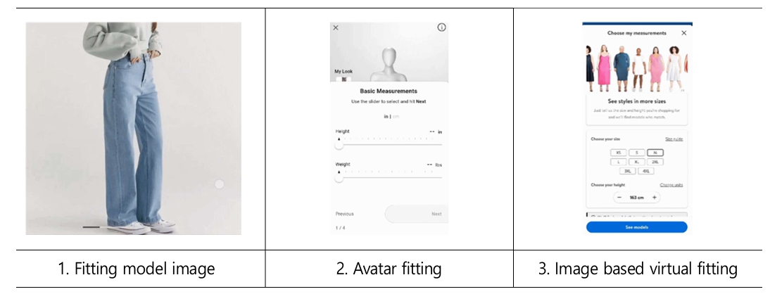 아바타 기반 가상 피팅은 소비자가 직접 입력한 신체 치수(키, 몸무게, 어깨너비 등)를 바탕으로 개인화된 3D 아바타를 생성하고, 여기에 가상 의류를 입혀보는 방식이다. 이 기술은 디지털 아바타를 통해 실제와 유사한 피팅 효과를 구현함으로써, 소비자에게 현실적인 착용감을 간접적으로 경험하게 한다(Choi and Lim, 2010).