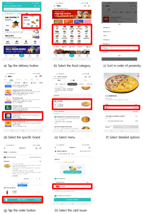 음식 주문 과업은 배달 앱을 활용하여 사용자가 음식을 선택하고 결제 직전까지 진행하는 방식으로 수행되었다. 과업은 사용자가 배달 버튼을 눌러 원하는 음식 카테고리를 탐색하고, 스크롤을 내려 원하는 가게를 찾아 메뉴를 선택하는 흐름으로 구성되었으며, 메뉴 선택 후 장바구니 및 결제 페이지로 이동하여 주문을 마무리하는 방식이다(Figure 3).