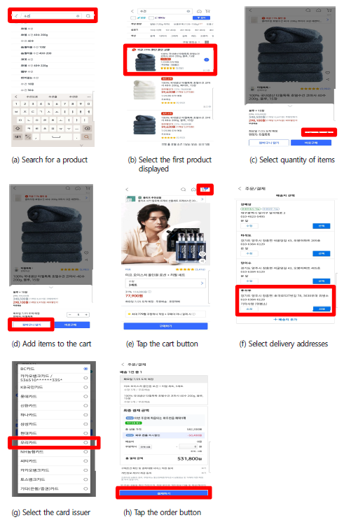 모바일 쇼핑 과업은 쇼핑 앱을 이용하여 제품을 검색하고 선택하여 장바구니에 담은 후, 결제 직전 단계까지 진행하는 방식으로 수행되었다. 실험 환경은 상품명, 배송지, 결제 카드사 등을 현실적이고 다양한 조건으로 구성하였다. 피실험자는 제품 검색부터 결제까지 총 8단계의 모바일 쇼핑 과업을 수행하였다(Figure 2).