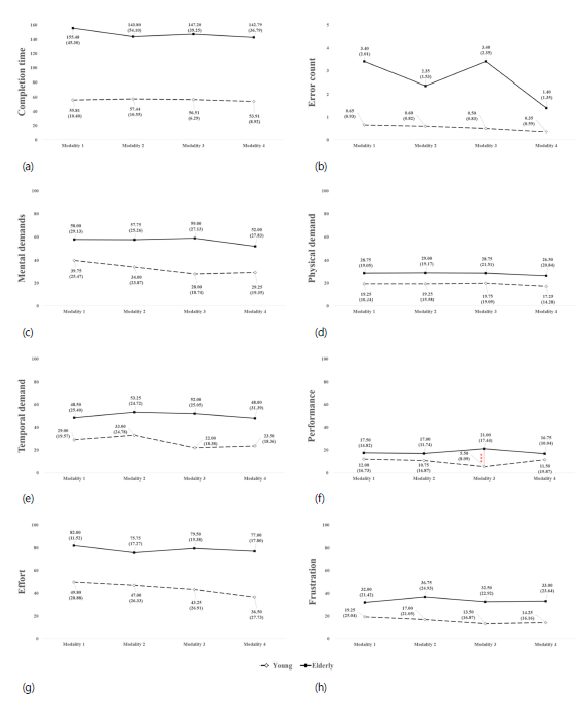 모달리티 4에서 고령층이 청년층보다 유의하게 높은 완료 시간, 에러 횟수를 기록하였다.