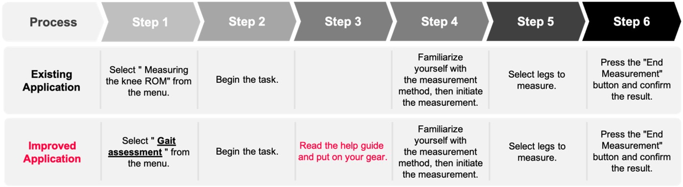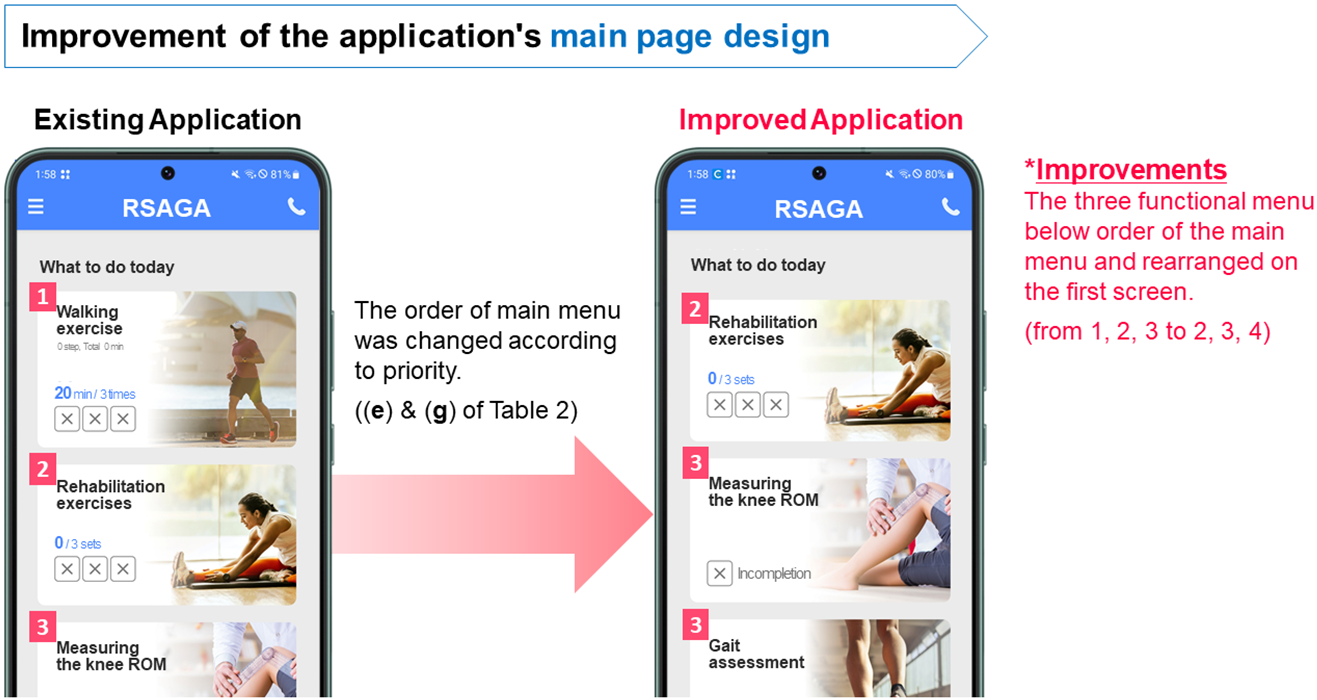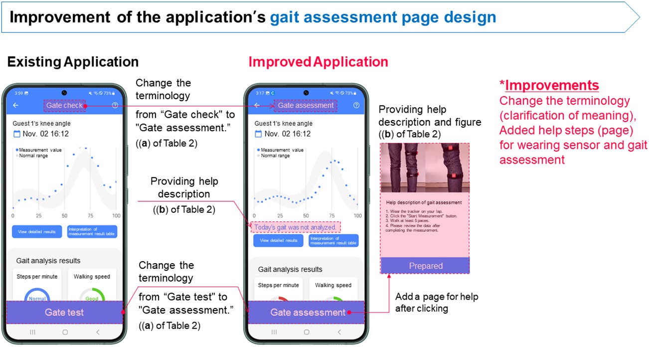 In gait assessment, the title was changed from "gait check" to "gait assessment," and in measuring the knee ROM, the term was changed from "daily joint angle measurement" to "measuring the knee ROM." Additionally, in both gait assessment and measuring the knee ROM, assistance was added to indicate today's measurement status and help with measurement preparation (Barros et al., 2014; Morey et al., 2019). Furthermore, a sound notification was introduced during the 3-second waiting period before starting to walk (Kascak et al., 2014; Silva et al., 2014). The improvements of before and after can be seen in Figure 3.