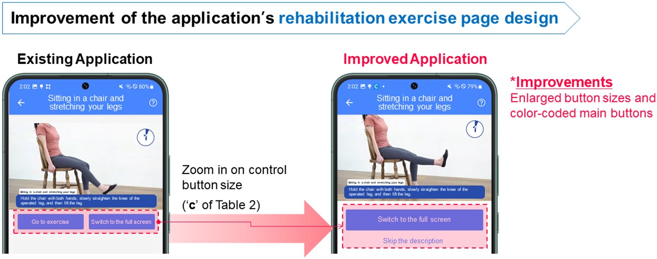 In rehabilitation exercises, the main heading was changed from "essential exercises" to "rehabilitation exercises," the button size was increased, and the space between images and text was expanded (de Almeida et al., 2015; Harte et al., 2017). The screens for rehabilitation exercises before and after improvement can be observed in Figure 2.