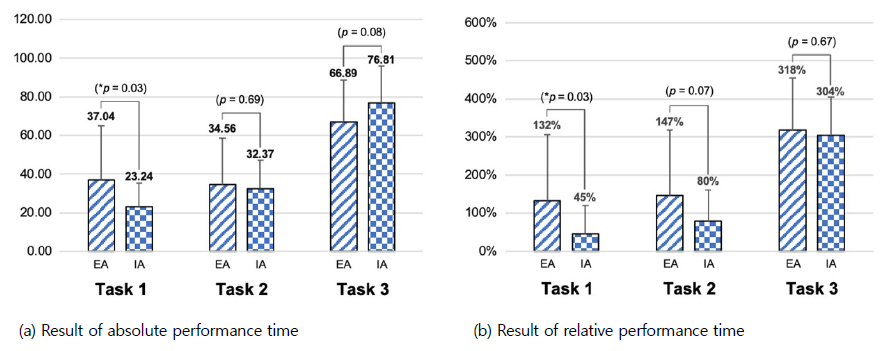 Efficiency was analyzed using an independent t-test. With one independent variable, improvement status (ImSt), influencing five dependent variables (absolute performance time, relative performance time, absolute click count, relative click count, error count), an independent t-test was conducted to determine if there were significant differences in the averages of Task 1, 2, and 3 (p < 0.05).