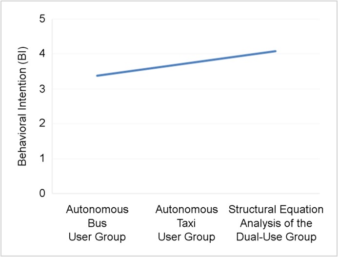 마지막으로, Behavioral Intention (BI)에서는 Autonomous Taxi User Group이 Autonomous Bus User Group보다 평균 점수가 높았으며 (MeanDiff = 0.34, p < 0.01), Structural Equation Analysis of the Dual-Use Group은 두 집단 모두보다 유의미하게 높은 결과를 보였다(p < 0.001). 이는 다중 경험 집단이 향후 자율주행 대중교통을 지속적으로 이용하려는 의지가 가장 강함을 보여준다.