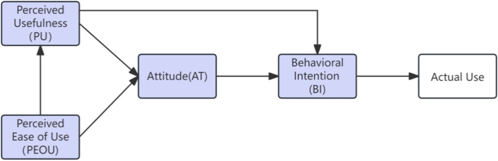 기술 수용모형(Technology Acceptance Model, TAM)은 Davis가 합리적 행동 이론(Theory of Reasoned Action, TRA)을 바탕으로 제안한 정보 시스템 수용 이론이다. 이 모형은 사용자의 기술 수용 의도는 지각된 유용성(Perceived Usefulness)과 지각된 사용 용이성(Perceived Ease of Use)에 의해 결정된다고 본다. 지각된 유용성은 해당 기술이 작업 또는 학습에 도움이 된다고 인식하는 정도를 의미하며, 지각된 사용 용이성은 사용자가 해당 기술을 배우고 사용하는 것이 얼마나 쉬운지를 인식하는 정도를 의미한다(Guner and Acarturk, 2018). 기술수용모형(TAM)의 기본 구조는 Figure 1에 제시하였다.