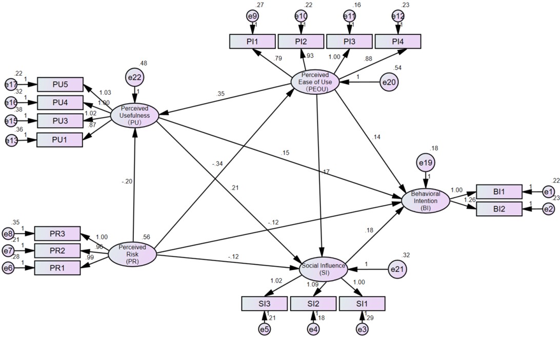 종합적으로 볼 때, Social Influence (SI)는 인지 변수와 행동 의도 간의 관계에서 핵심적인 심리적 매개 요인으로 작용하였다. SI는 Perceived Usefulness (PU)와 Perceived Ease of Use (PEOU)의 긍정적 영향을 강화시키는 동시에, Perceived Risk (PR)의 부정적 영향을 완화시키는 이중적 조절 기능을 수행하는 것으로 해석된다.