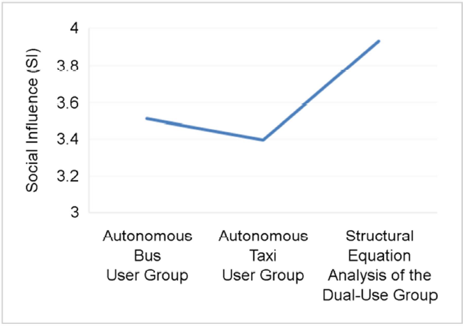넷째, Social Influence (SI)에서 분산분석(ANOVA) 결과, Dual-Use Group의 평균값이 Autonomous Bus User Group과 Autonomous Taxi User Group보다 유의하게 높게 나타났다(p < 0.001). 이는 다양한 자율주행 교통수단을 경험한 고령자가 주변의 중요한 타인이나 사회적 규범으로부터 더 큰 영향을 받음을 의미한다. 즉, 다중 이용 경험은 고령자가 주변 사람들의 긍정적인 태도나 권유에 더 쉽게 영향을 받아 자율주행 기술을 수용하려는 의도를 강화시키는 요인으로 작용함을 시사한다.