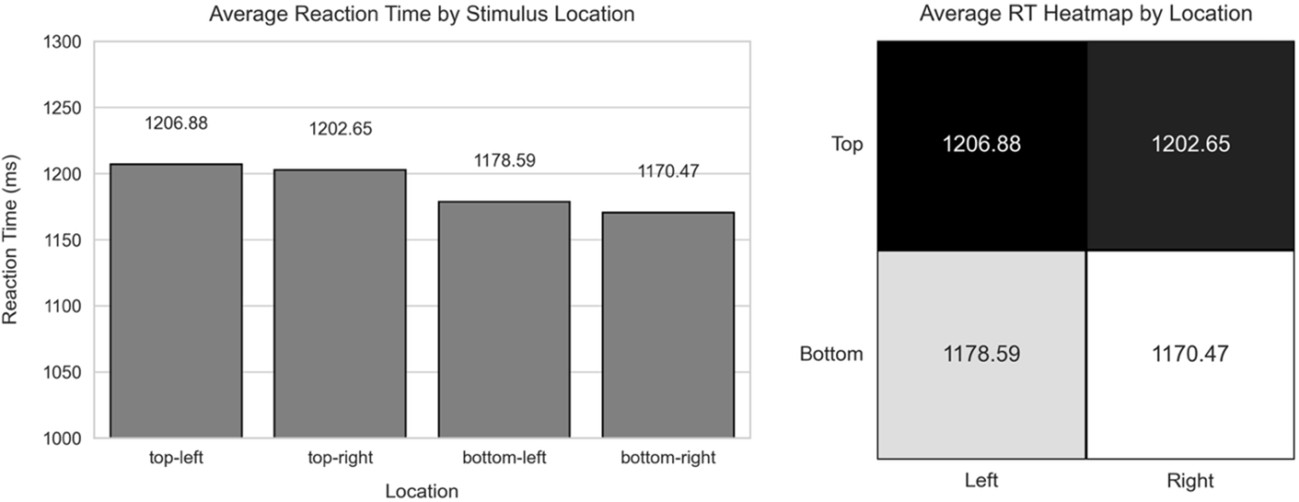 자극 위치에 따른 평균 반응시간은 하단이 빨랐으며 그 중 우하 위치에서 가장 짧았고, 좌상과 우상 위치에서 가장 길었다(Table 4, Figure 7). 하지만 Table 5의 분산분석(One-way ANOVA) 결과를 보면, 위치에 따른 반응시간의 차이는 유의수준 0.05에서 통계적으로 유의하지 않았다(F = 0.77, p = 0.52).