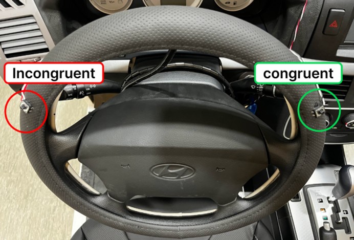 피실험자의 반응(response)은 핸들에 부착된 버튼으로 측정하였으며(Figure 4), 아두이노(Arduino) 기반 입력 장치를 통해 반응시간을 기록하였다. 오른손 버튼은 일치 조건(congruent)으로 판단한 경우, 왼손 버튼은 불일치 조건(incongruent)으로 판단한 경우에 사용하도록 고정 매핑하였다. 실험 전 참가자에게 양손을 각 버튼 위에 두도록 안내하고, 모든 참가자가 두 조건을 모두 수행하므로 버튼 매핑은 조건 간 비교에 영향을 주지 않음을 명시하였다.