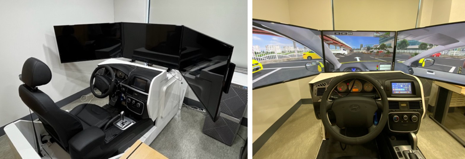 본 실험에서는 실제 차량과 유사한 환경의 운전 시뮬레이터를 사용하였다(Figure 1). 시뮬레이터는 시트, 핸들, 페달, 계기판 등 기본 조작 장치로 구성되었으며, 시트는 참가자의 체형에 맞게 조정할 수 있다. 시뮬레이터는 해상도 1,920×1,080 픽셀의 43인치 디스플레이 3대를 가로로 배열해 총 2,904×569mm의 시야를 제공하였다. 화면에는 도로, 차량, 미러, HUD UI 자극 등 운전 환경이 표시되었으며, 주행 코스는 한국도로교통공단의 실제 운전면허 시험 도로(강남 A · B, 강서 A)를 기반으로 구현하였다. 또한 신호등, 다른 차량 등의 교통 요소를 포함해 실제와 유사한 환경을 재현하였다.