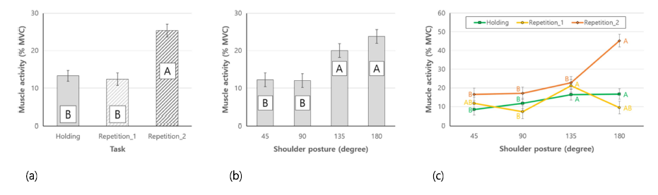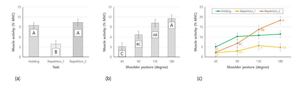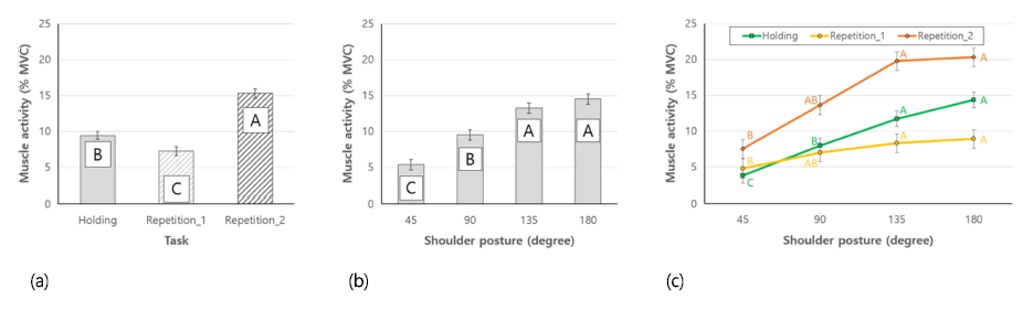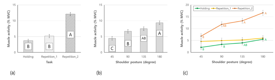 중간삼각근의 경우, 고빈도 반복작업에서 가장 큰 근활성도, 저빈도 반복작업에서 가장 작은 근활성도가 관측되었다(Figure 5a). 어깨 각도의 경우, 135, 180°에서 유의하게 높은 근활성도가 관측되었다(Figure 5b). 교호작용의 경우, 모든 과업에 대하여 어깨 각도가 증가할수록 근활성도도 유의하게 증가하였으나, 그 증가폭은 고빈도 반복작업에 상대적으로 큰 것으로 나타났다(Figure 5c).