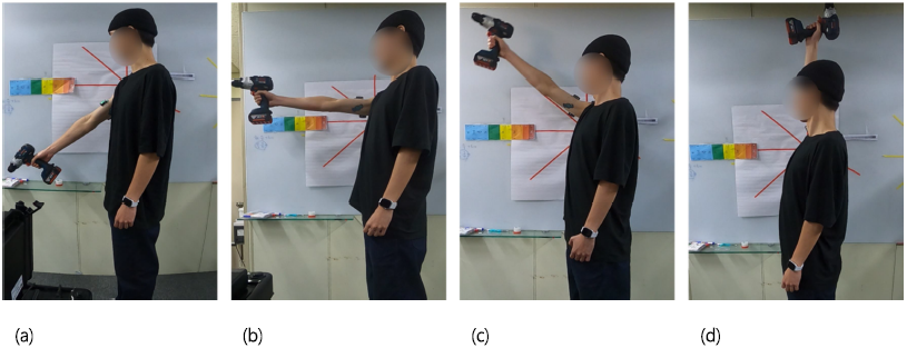 반복적인 상지 움직임은 제조업, 건설업, 물류업 등 다양한 산업현장에서 매우 빈번하게 수행되는 작업이다. 특히 전동드릴이나 드라이버와 같은 공구를 사용하는 과업은 어깨와 팔의 지속적이고 반복적인 사용을 야기하며, 이는 작업관련성 근골격계질환(work-related musculoskeletal disorders, WMSDs)의 주요 원인으로 알려져 있다. 선행연구에 따르면 어깨를 들어올린 자세는 어깨 관절에 가해지는 생체역학적 부하를 증가시키고, 주요 근육의 피로도를 크게 높여 불편감을 유발한다(Nimbarte et al., 2012; Shin et al., 2012; Fewster and Dickerson, 2021). 특히 어깨 높이 이상에서 작업하는 근로자의 70%는 심각한 어깨 통증을 호소한다고 보고된 바 있으며(Bjelle et al., 1981), 중립자세로부터 팔을 올릴수록 근육부하는 증가한다고 알려져 있다(Wiker et al., 1989; Palmerud et al., 2000; Kim et al., 2003; Ferguson et al., 2013).