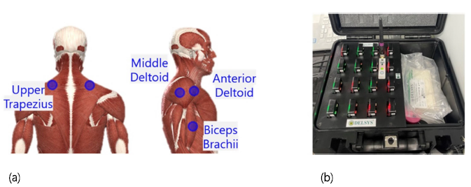 본 실험을 위해서 주력 방향의 주요 상지 근육(상부승모근, 중간삼각근, 전면삼각근, 상완이두근)의 표면 근전도가 측정되었다(Kadefors et al., 1976; Gerdle et al., 1988; Anton et al., 2001; Nussbaum, 2001). 표면 근전도 측정을 위해서 무선 근활성도 측정 장비인 Trigno wireless EMG system (Delsys, Natick, MA, USA)이 사용되었으며(Figure 2b), 센서의 부착위치는 SENIAM Guideline을 토대로 선정되었다(Figure 2a). 표면 근전도 신호의 Sampling rate는 2,158Hz이며, Butterworth second-order bandpass filter (Low frequency: 20Hz, High frequency: 450Hz)를 이용하여 필터링하였다. 전선으로 인한 노이즈를 제거하기 위하여 60Hz 노치필터가 활용되었다. 분석을 위하여 근육별 Maximum voluntary contraction (MVC)을 토대로 정규화된 값인 % MVC가 사용되었다. 상부승모근 MVC의 경우, 검사자가 피험자의 어깨 상부에서 아래 방향으로 누르면 피험자는 이에 저항하여 강하게 어깨를 들어올려 수축하도록 하였다(Smith et al., 2004). 중간삼각근의 경우, 어깨를 90°로 외전한 자세에서 검사자가 어깨 내전 방향으로 힘을 가하면 이에 저항하여 어깨 외전을 수행하도록 하였다(Smith et al., 2004). 전면삼각근의 경우, 어깨를 90°로 굴곡한 상태에서, 아래 방향으로 가해지는 힘에 저항하여 팔을 위로 들어올리도록 하였다(Konrad, 2005). 상완이두근의 경우, 팔꿈치를 90°로 굽힌 상태에서 팔꿈치 신전 방향으로 가해지는 힘에 저항여 팔꿈치를 최대로 굽히도록 하였다(Kidgell et al., 2010). 피험자가 특정 과업을 유지 또는 반복하다가 피로 또는 통증 등으로 인하여 더 이상 수행할 수 없다고 선언할 때까지 소요되는 시간을 최대유지시간이라고 정의하였으며, 스마트폰의 초시계를 이용하여 측정하였다.