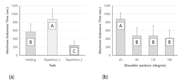 최대유지시간에 대한 과업 유형 및 어깨각의 주효과는 모두 통계적으로 유의하였으나(all p<0.05), 교호작용은 유의하지 않았다. 저빈도 반복작업 수행 시의 최대유지시간이 가장 길었으며, 그 다음으로 유지 과업, 고빈도 반복작업 순의 경향이 관측되었다(Figure 7a). 어깨 각도의 경우, 45° 자세에서 유의하게 큰 최대유지시간)이 관측되었으며, 90, 135, 180°에서는 유사한 최대유지시간이 나타났다(Figure 7b).