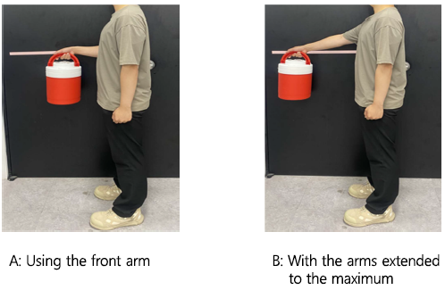 실험은 2가지의 작업 자세(A: 앞팔을 사용한 자세, B: 팔을 최대로 뻗은 자세)와 3가지 중량물의 무게(1.5kg, 3kg, 4.5kg)를 랜덤으로 선정하여 실시하였으며, Figure 1과 같이 다리를 편하게 펴고 팔꿈치 높이에서 두 가지 작업 자세에서 중량물을 들고 1분간 자세를 유지하였다. 실험 간 2분의 휴식 시간을 부여하였으며, 실험 참여자는 휴식 시간에 주관적 육체 부하 평가(Borg's Scale)를 실시하였다.
