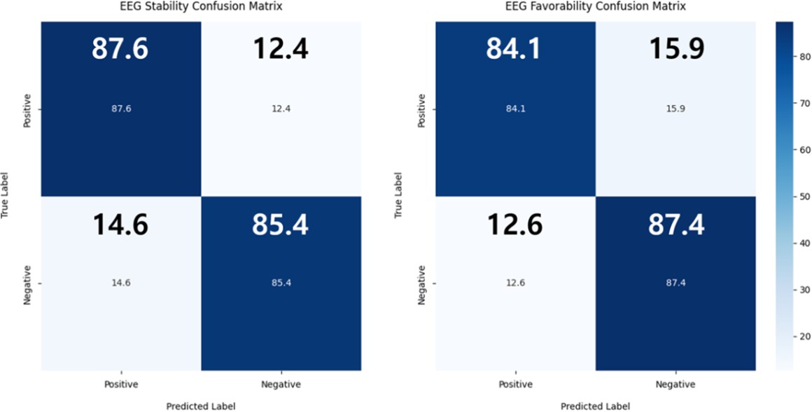 EEG 기반 이진 분류 결과는 Figure 3에 나타나 있다. 안정성 분류에서는 Balanced Accuracy 86.5%와 F1-score 86.6%를 기록하여 고 · 저 안정성 상태를 안정적으로 구분할 수 있음을 확인하였다. 선호도 분류 역시 Balanced Accuracy 85.8%, F1-score 85.5%로 비교적 높은 성능을 보였다. 이는 EEG 신호가 만족도의 개별 차원을 효과적으로 반영함을 시사한다.