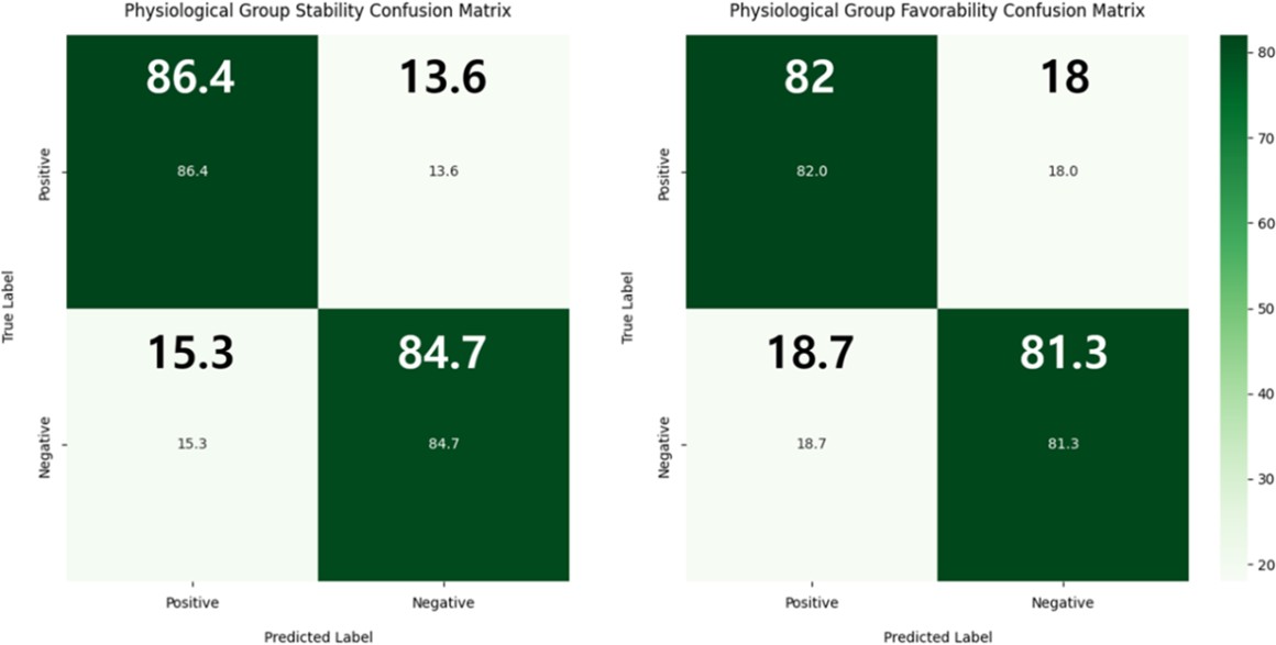 Physiological 그룹의 이진 분류 결과는 Figure 5에 나타나 있다. 안정성 분류에서는 Balanced Accuracy 85.6%, F1-score 85.7%로 비교적 안정적인 성능을 보였으며, 선호도 분류에서는 Balanced Accuracy와 F1-score가 모두 81.7%로 나타났다. 전반적으로 생리 신호는 안정성과 선호도의 전반적인 경향을 포착할 수 있었으나, EEG 기반 결과에 비해 성능이 다소 낮게 나타났다. 특히 선호도의 경우 분류 정확도가 비교적 낮게 나타났는데, 이는 사진 분류에서 나타난 문제와 같은 결과로 해석된다.