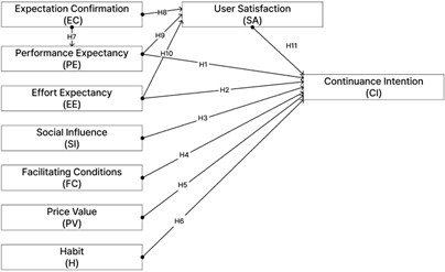 본 연구는 UTAUT2와 ECM을 결합한 통합 관점에서 한국 대학 수업 맥락의 중국인 유학생을 대상으로 AI 통번역 도구 지속사용의도(CI)를 설명하는 연구모형을 제시한다. 최종 모형은 성과기대(PE), 노력기대(EE), 사회적 영향(SI), 촉진조건(FC), 가격가치(PV), 습관(H), 기대확인(EC), 만족(SA), 지속사용의도(CI)로 구성되며 Figure 3에 제시하였다.
