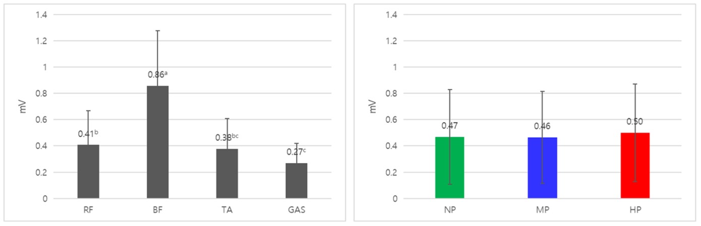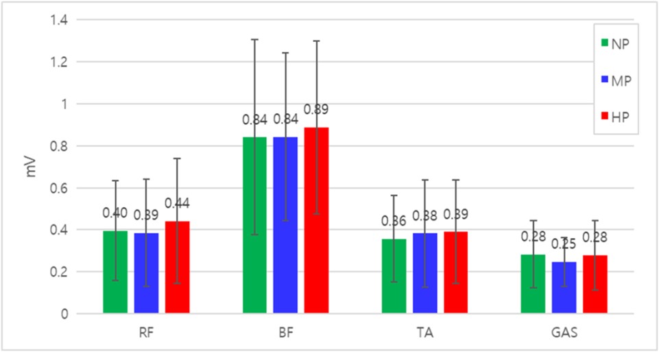 첫째, MVC 분석 결과, 대퇴직근(RF)의 MVC는 0.40~0.44mV, 대퇴 이두근(BF) 0.84~0.89mV, 전경골근(TA) 0.21~0.24mV, 비복근(GAS) 0.25~0.27mV 범위로 나타났으며, 모든 근육에서 압박 수준 변화에 따른 차이는 통계적으로 유의하지 않았다. 이를 통해 근전도 센서 부착 부위의 압박 수준의 변화가 동일 근육 내 MVC 경향성에 실질적인 영향을 미치지 않음이 확인되었다.