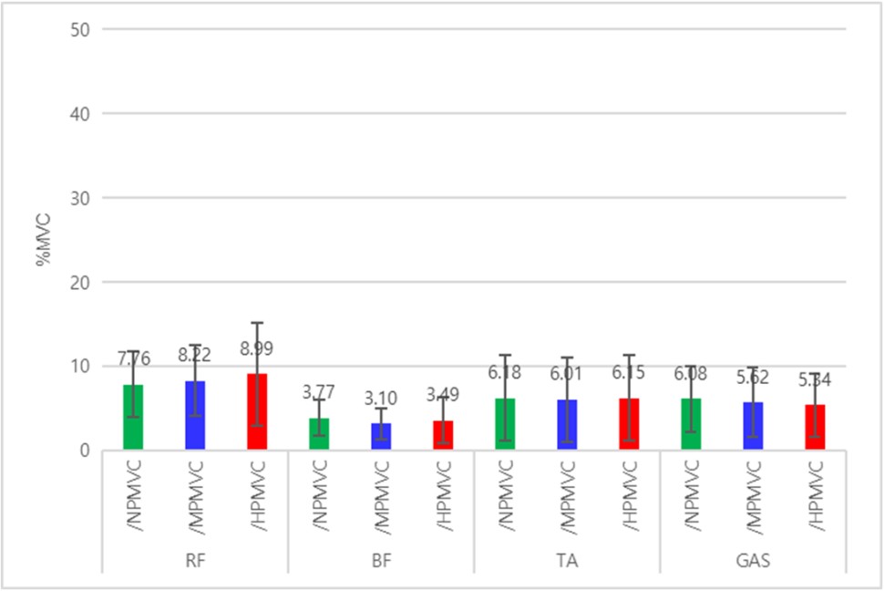 셋째, 정규화 방법[NP로 정규화: NPMVC, MP로 정규화: MPMVC, HP로 정규화: HPMVC)의 변경이 하지 외골격(CEX) 착용 시 하지 근육[대퇴직근(RF), 대퇴 이두근(BF), 전경골근(TA), 비복근(GAS)]의 근활성도 분석 결과에 미치는 영향을 분석하고자 하였다.
