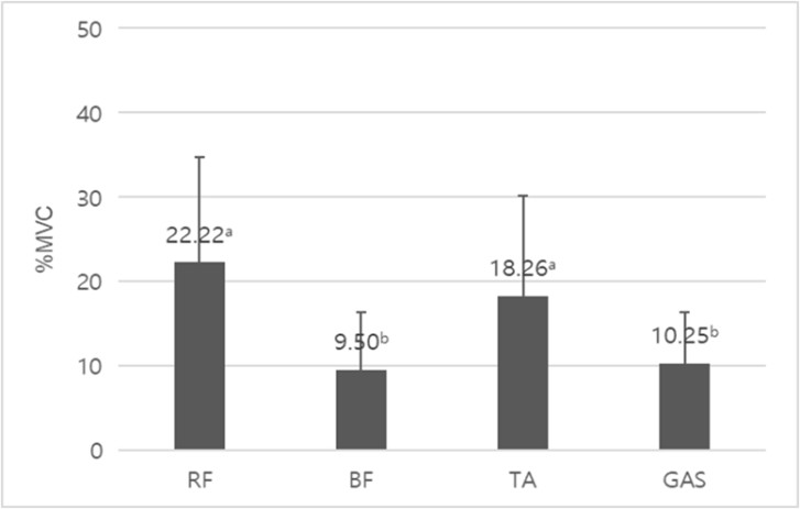 MVC 데이터 분석에서는 근육에 따른 차이에서 허벅지 근육[대퇴직근(RF), 대퇴 이두근(BF)]이 종아리 근육[전경골근(TA), 비복근(GAS)]보다 상대적으로 높은 경향을 보였으며, 허벅지 근육 중 대퇴 이두근(BF)이 가장 높은 MVC를 보였다. 이는 허벅지 근육[대퇴직근(RF): 51.7cm2, 대퇴 이두근(BF): 35.0cm2]의 생리학적 단면적(PCSA: Physiologic Cross-Sectional Area)이 종아리 근육[전경골근(TA): 15.4cm2, 비복근(GAS): 23.7cm2]보다 상대적으로 큰 경향에 기반한 결과로 사료된다(Ward et al., 2009; Charles et al., 2019). 또한, 허벅지 근육 간 비교 시 대퇴직근(RF)의 PCSA가 대퇴 이두근(BF)보다 큼에도 불구하고, MVC 값이 다소 낮은 이유는, 대퇴직근(RF)이 고관절과 무릎을 모두 가로지르는 2관절 근으로서, 고관절 굴곡 상태에서 무릎 신전을 수행할 때 길이-장력 관계(force-length relationship) 상 불리한 근 길이가 형성되기 때문에 본 실험에서 실행한 MVC 측정 방법에 의한 영향으로 사료된다(Herzog et al., 1990).