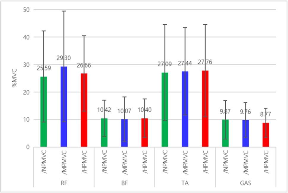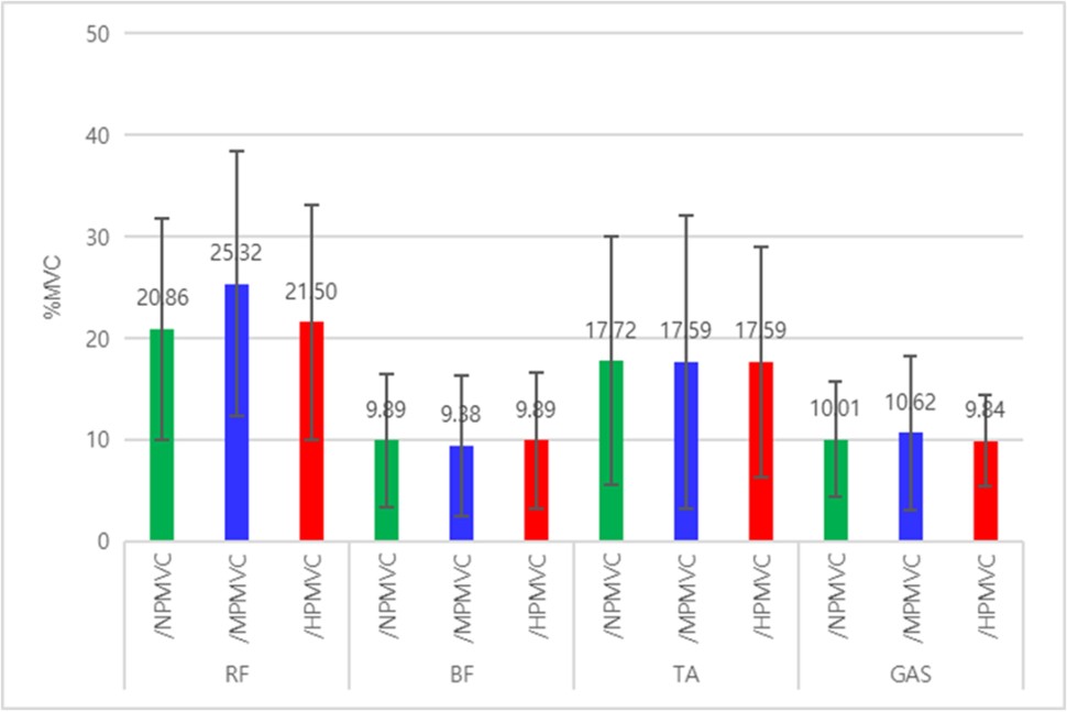 첫째, 세 가지 압박 수준(압박 없음: No Pressure, NP; 중간 압박: Middle Pressure, MP; 높은 압박: High Pressure, HP)이 하지 근육[대퇴직근(Rectus Femoris, RF), 대퇴 이두근(Biceps Femoris, BF), 전경골근(Tibialis Anterior, TA), 비복근(Gastrocnemius, GAS)]의 최대수의근력(Maximum Voluntary Contraction: MVC)에 미치는 영향을 분석하고자 하였다.