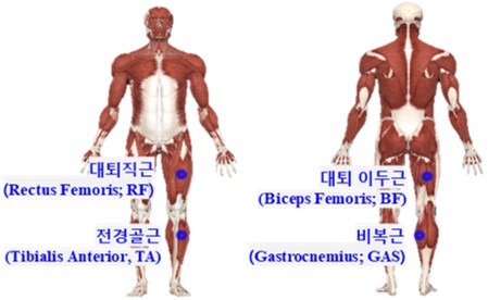 본 연구는 근육의 활성도를 평가하기 위해 무선 근전도(Trigno Research System, Delsys, MA, USA)를 사용하였으며 주력손측의 대퇴직근(RF), 대퇴 이두근(BF), 전경골근(TA), 비복근(GAS) 등 총 4개의 근육(Figure 1)에 센서를 부착한 후, 피험자의 근육 별 정규화를 수행하기 위해 MVC를 각각 측정하였다. 근전도는 1,500Hz로 수집하였으며, band pass filter (20~450Hz)로 4th order Butterworth filter를 수행한 뒤, RMS (Root-mean square: 50ms)를 사용하여 smoothing을 수행하였다.