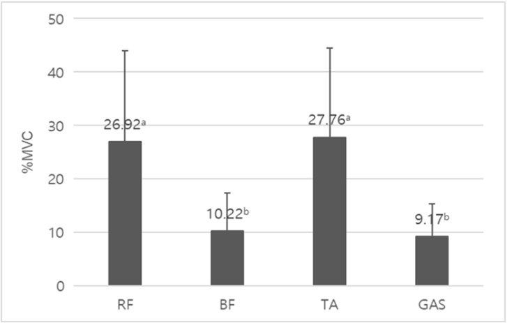 근육에 따른 MVC 데이터의 Tukey 사후검정 결과 근육 간 유의미한 차이를 보였는데(p<0.05), 대퇴 이두근(BF) 근육의 MVC가 가장 높은 근활성도(0.86mV)를 보인 반면, 비복근(GAS)의 MVC는 가장 낮은 근활성도(0.27mV)를 보였다. 대퇴 이두근(BF)은 대퇴직근(RF: 0.41mV), 전경골근(TA: 0.38mV), 비복근(GAS)보다 각각 약 2.09배, 2.26배, 그리고 3.18배 더 높은 MVC 값을 보였다(Figure 4).