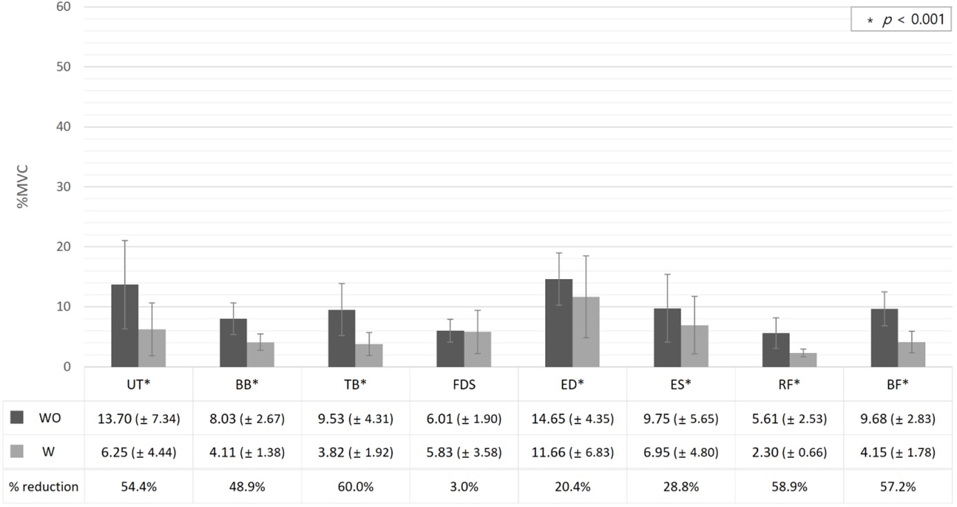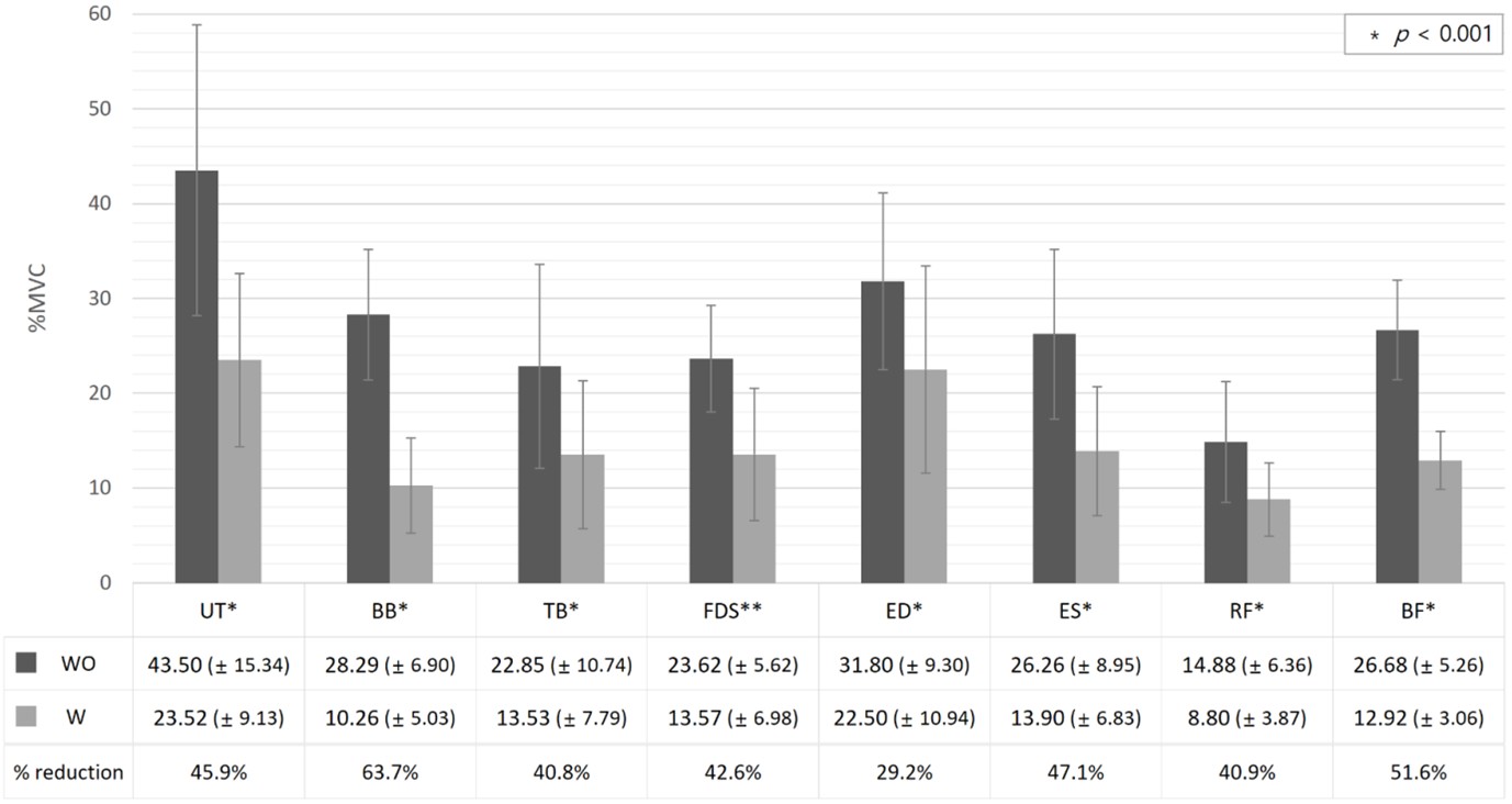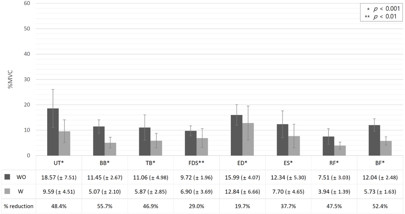 평균 %MVC에 대한 근육별 결과에서 모든 근육에서 W 조건이 WO 조건보다 유의하게 낮았다(p < 0.01). 특히 상완이두근(BB)과 대퇴이두근(BF)에서 각각 55.7%와 52.4%의 감소율을 보여 가장 큰 차이를 나타냈으며, 상부승모근(UT), 대퇴직근(RF)과 상완삼두근(TB)에서도 45% 이상 감소하였다. 반면, 총지신근(ED)에서는 19.7%로 감소 폭이 상대적으로 작았다(Figure 6).
