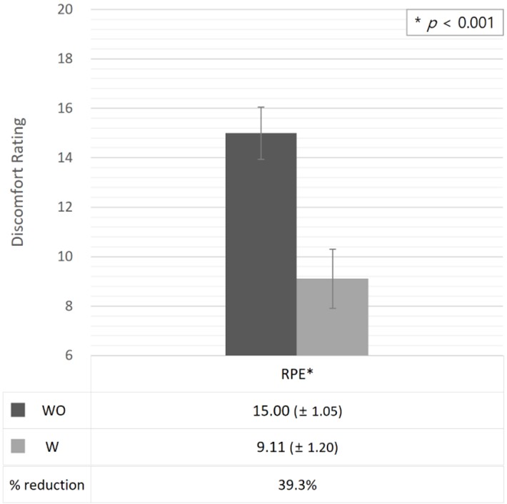 주관적 불편도는 W 조건에서 평균 9.11점으로, WO 조건의 평균 15.00점보다 약 39.3% 낮았다. 두 조건 간 차이는 통계적으로 매우 유의하였다(p < 0.001) (Figure 9).