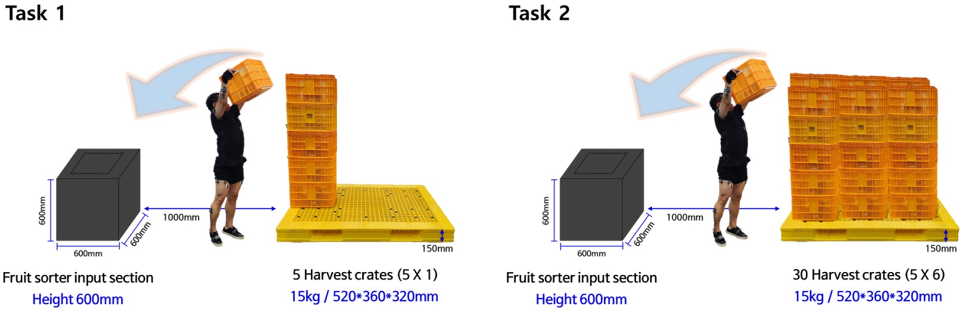 과수 선별 작업장에서 이루어지는 수확상자 운반에 대한 인체부담 평가를 위해 실험실 내에 실제 선별 작업장의 작업 현장과 유사한 150mm 높이의 팔레트에 5단으로 적재되어 있는 수확상자를 600mm 높이의 선별 투입부로 운반하는 작업환경을 구현하였다. 이후 장시간 연속 동작에서 발생할 수 있는 땀으로 인한 센서 위치 변화와 누적 피로에 의한 영향을 최소화하기 위하여 근전도와 주관적 불편도를 측정하기 위한 첫 번째 과업과 작업 시간을 측정하기 위한 두 번째 과업으로 나누어 평가를 수행하였다(Figure 1). 수확상자의 크기는 일반적인 수확상자의 크기인 520*360*320(가로*세로*높이)mm이며 무게는 사과 재배 농업인의 수확상자 취급 무게에 대한 선행 연구를 참고하여 15kg으로 설정하고 상자에 무게추를 내측 중앙부에 고정하여 무게를 맞추었다(Seo et al., 2022).