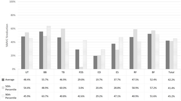 90th percentile %MVC에서도 모든 근육에서 W 조건이 WO 조건보다 유의하게 낮았다(p < 0.001). 상완이두근(BB)과 대퇴이두근(BF)에서 각각 63.7%와 51.6%의 감소율을 보여 가장 큰 차이를 보였으며, 상부승모근(UT)과 척추기립근(ES)에서도 45% 이상의 감소가 확인되었다. 총지신근(ED)에서는 약 29%로 감소 폭이 가장 작았다(Figure 8).
