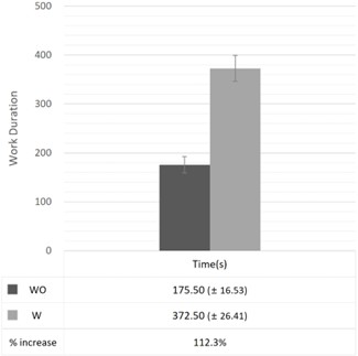 작업 시간 비교는 조건당 표본 수가 6으로 제한되어 통계적 검정은 시행하지 않았으나 W 조건에서 평균 372.5초로, WO 조건의 평균 175.5초보다 112.3% 증가하였다(Figure 10).