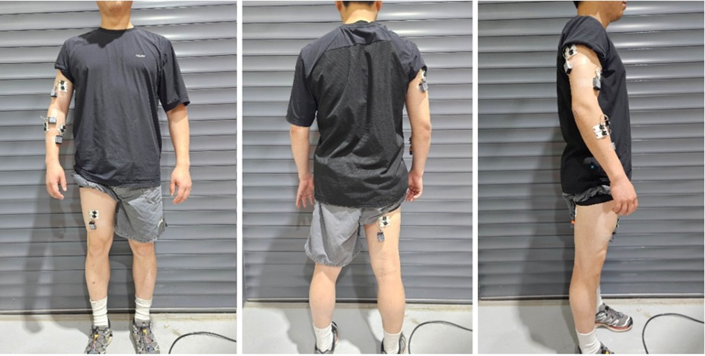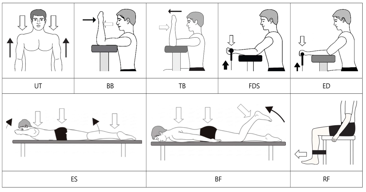 본 연구는 근육의 부하를 정량적으로 측정하기 위해 근전도 시스템 Desktop DTS (Noraxon inc, AZ, USA)를 사용했으며 피험자의 오른쪽 상부승모근(Upper Trapezius, UT), 상완이두근(Biceps Brachii, BB), 상완삼두근(Triceps Brachii, TB), 척측수근굴근(Flexor Digitorum Superficialis, FDS), 총지신근(Extensor Digitorum, ED), 척추기립근(Erector Spinae, ES), 대퇴이두근(Biceps Femoris, BF), 대퇴직근(Rectus Femoris, RF) 총 8개의 근육에 근전도 센서를 부착하였으며 부착 위치는 SEMIAM을 참고하였다(Figure 3).