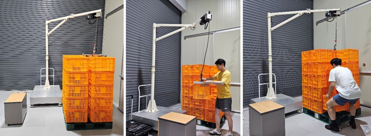 본 연구에서 사용하기 위해 자체 개발된 운반 편이장비는 수확상자 운반을 위한 이동식 호이스트형 장비로, 수확상자 운반 시 신체의 부담을 완화하는 것을 목적으로 한다. 장비는 크게 바닥부, 기둥부, 상부암, 호이스트로 이루어져 있으며 기둥부(360° 수동 회전)와 상부암(220° 회전)의 2자유도 구조로 설계되어 작업자가 원하는 방향으로 상자를 이송할 수 있다. 정격 사용중량은 20kg, 최대 사용중량은 40kg이며, BLDC 모터(200W, DC 24V)를 장착하여 손잡이 부분의 리모콘 버튼을 이용하여 상자를 들어올리고 내린다. 실험에서는 수확상자 선별 작업 위치로 운반하는 데 사용하였다(Figure 2).