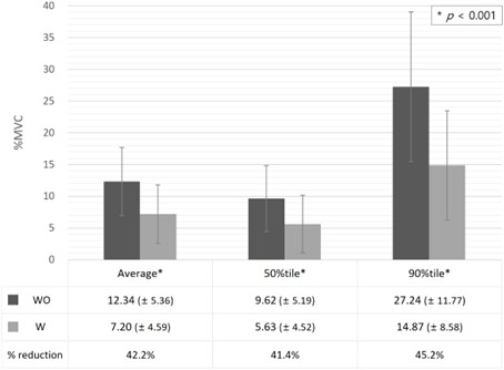 실험 조건(WO, W)에 따른 전체 근전도(%MVC) 결과는 평균, 50th percentile, 90th percentile 모든 지표에서 W 조건이 WO 조건에 비해 유의하게 낮은 값을 나타냈으며(p < 0.001), 각각 42.2%, 41.4%, 45.2%의 감소율을 보였다(Figure 5).