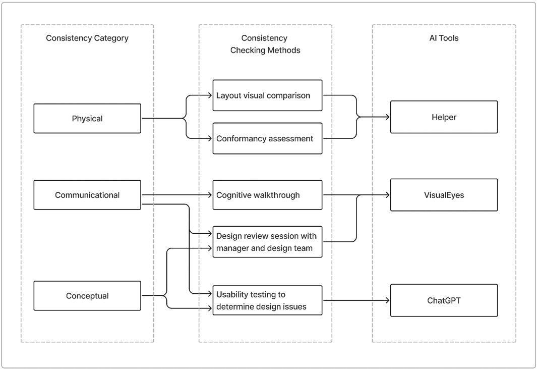 After categorizing these methods, we identified and paired AI tools that could support each group. We focused on AI tools that can be integrated into an industry-standard design platform such as Figma, to ensure that the recommended tools are both practical and widely accessible for designers. For instance, we found that physical consistency checking methods can benefits greatly from tools that leverage Large Vision Model, which can compare previously-designed UI screens in a given design file to spot inconsistencies in style. Unfortunately, no design-file-wide LVM tools as such is available currently in the form of plugin. However, less complexed LVM plugins such as Helper can still be leveraged as it can scan for inconsistency within a design screen.