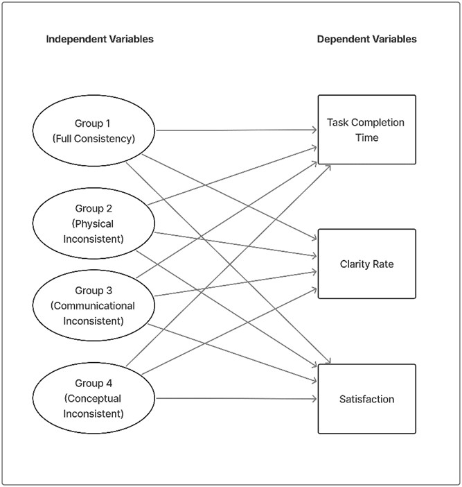 - H4: The effects of physical, communicational, and conceptual inconsistencies on task time, clarity rate, satisfaction, and perceived consistency will not differ statistically.