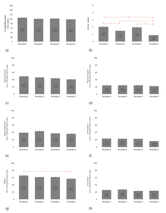 사후 분석 결과, 에러 횟수(Error count)에서 시각 정보만 제공되고 도움말 기능이 없는 모달리티 1과 시각, 청각 정보가 제공되며 도움말 기능이 있는 모달리티 4 간의 차이가 나타났다(p < 0.001). 시각, 청각 정보는 동일하게 제공되지만 도움말 기능이 없는 모달리티 3과 도움말 기능이 있는 모달리티 4 간의 차이도 유의하였다(p < 0.001). 모달리티 1과 도움말 기능이 있는 모달리티 2 간(p < 0.05), 모달리티 2와 모달리티 4 간(p < 0.05)의 차이 또한 통계적으로 유의하였다. 노력(Effort) 항목에서는 모달리티 1과 모달리티 4의 차이가 통계적으로 유의하였다(p < 0.05). 성취도(Performance)는 F(3, 114) = 3.093, p = 0.030, η2 = 0.075로 유의하였으나, 사후 분석에서는 유의한 쌍 비교가 나타나지 않았다(Figure 5).