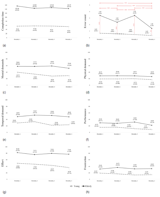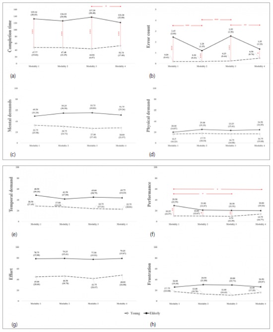 모달리티 4에서 고령층이 청년층보다 유의하게 높은 완료 시간, 에러 횟수를 기록하였다.
