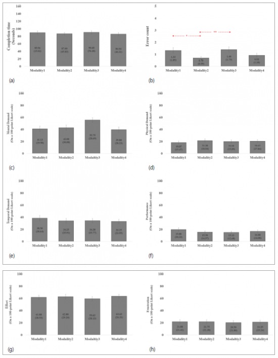 평균값 비교 결과, 에러 횟수(Error count), 정신적 요구(Mental demand), 시간적 요구(Temporal demand), 좌절(Frustration)의 항목에서 모달리티 4(시각+청각 정보 제공, 도움말 제공) 조건이 가장 낮은 평균값을 보였다(Figure 7).
