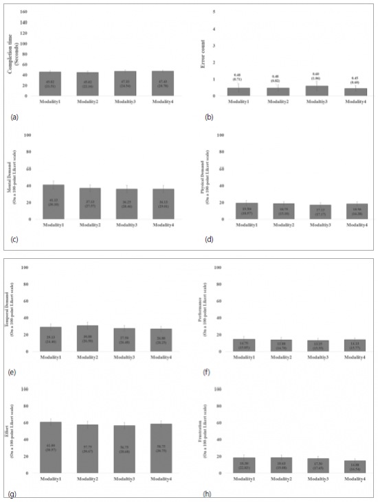 평균값 비교 결과, 성취도(Performance), 시간적 요구(Temporal demand), 신체적 요구(Physical demand), 정신적 요구(Mental demand), 완료 시간(Completion time) 등 대부분의 항목에서 모달리티 4(시각+청각 정보 제공, 도움말 제공) 조건이 가장 낮은 평균값을 보였다(Figure 6).
