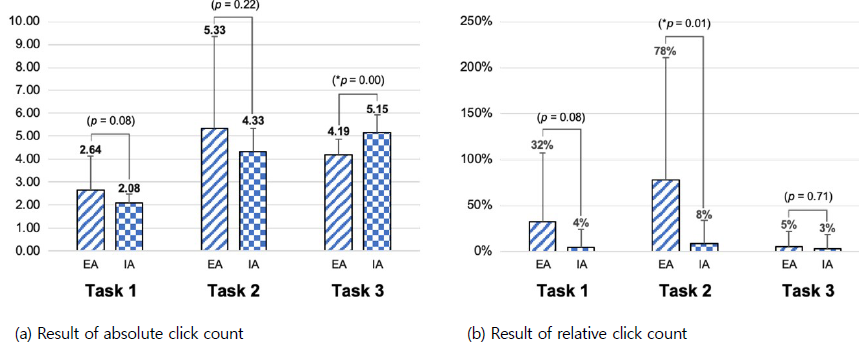 A 21% and 35% reduction in the absolute click count was observed in Tasks 1 and 2, respectively, after improvement (Figure 9(a)). Regarding relative click count compared to expert click counts, there was an 88%, 92%, and 36% decrease in Tasks 1, 2 and 3, respectively, post-improvement (Figure 9(b)).