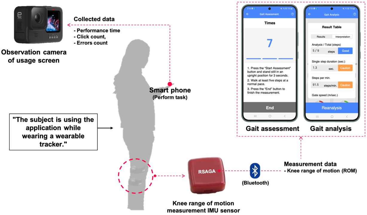 The wearable tracker and application visually display recovery status and progress. The wearable tracker's accelerometers and gyro sensors were used to measure knee angles and walking patterns. These data were then transmitted to a mobile application installed on a smart phone via Bluetooth. Participants' use of the application was recorded using the observation camera (Figure 7).