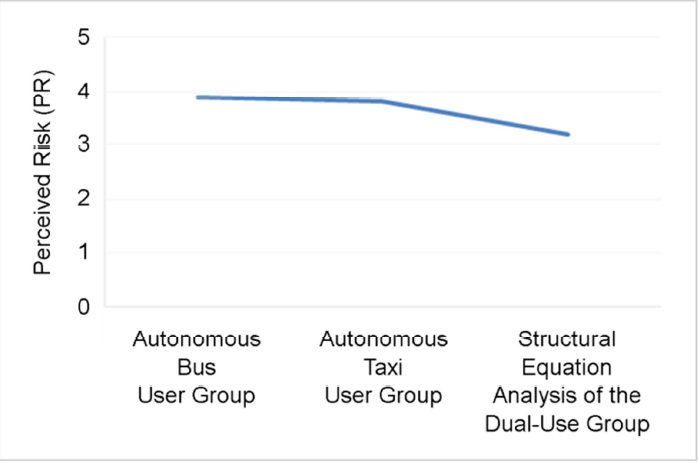 셋째, Perceived Risk (PR)에서는 Autonomous Bus User Group과 Autonomous Taxi User Group 간에는 차이가 없었지만, 두 집단 모두 Structural Equation Analysis of the Dual-Use Group보다 유의미하게 높은 값을 나타냈다(p < 0.001). 이는 다양한 교통수단 경험을 가진 고령자가 상대적으로 위험을 덜 인식하며, 단일 경험 집단이 불안감을 더 크게 느낀다는 것을 의미한다.