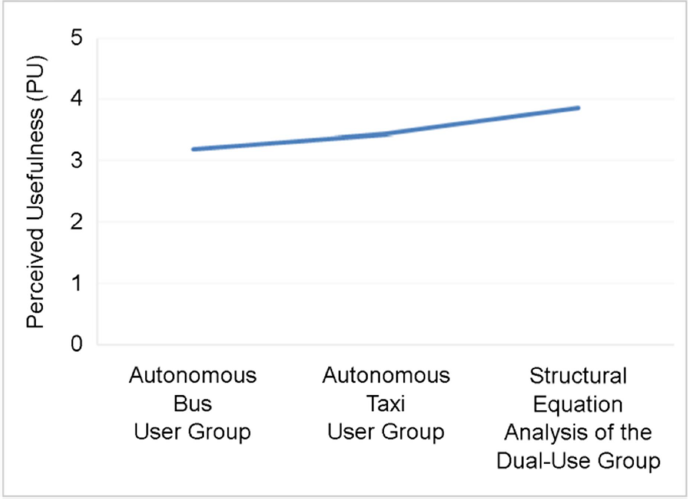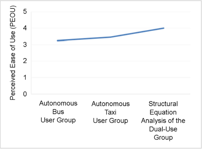 둘째, Perceived Ease of Use (PEOU)에서는 Autonomous Taxi User Group이 Autonomous Bus User Group보다 높았고(MeanDiff = 0.22, p < 0.05), Structural Equation Analysis of the Dual-Use Group은 두 집단보다 모두 높은 결과를 보였다(p < 0.001). 이는 자율주행 택시가 상대적으로 조작이 간편하게 인식되며, 다양한 경험이 숙련도와 신뢰를 강화한다는 점을 시사한다.