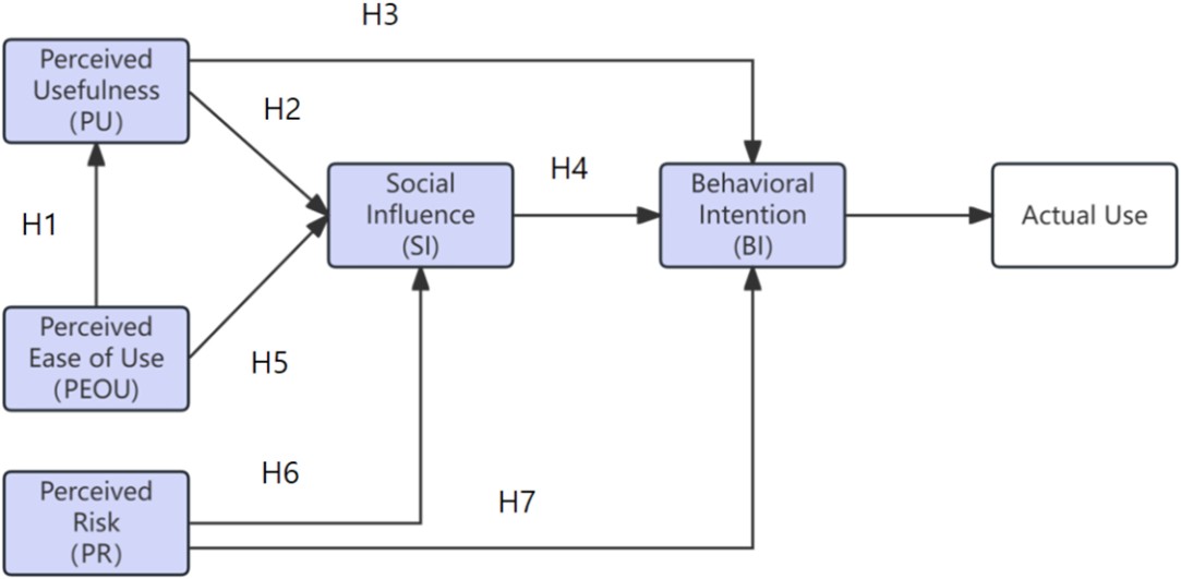 종합적으로 볼 때, Social Influence (SI)는 인지 변수와 행동 의도 간의 관계에서 핵심적인 심리적 매개 요인으로 작용하였다. SI는 Perceived Usefulness (PU)와 Perceived Ease of Use (PEOU)의 긍정적 영향을 강화시키는 동시에, Perceived Risk (PR)의 부정적 영향을 완화시키는 이중적 조절 기능을 수행하는 것으로 해석된다.