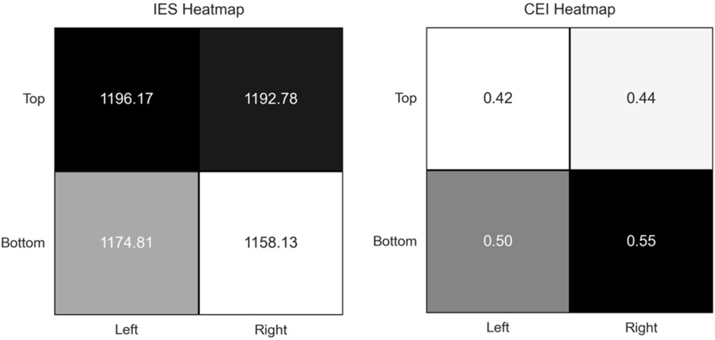 정확도와 반응시간을 활용하여 인지 효율성 척도인 IES와 CEI를 산출하였다. Figure 8을 보면, CEI 기준 효율 순위는 우하 > 좌하 > 우상 > 좌상 순으로 나타났다 그리고 위치별 CEI 차이에 대한 분산분석 결과(Table 6), CEI는 유의수준 0.05에서 위치에 따라 통계적으로 유의한 차이가 확인되었다(F = 5.11, p = .004). 반면 Table 5를 보면, IES는 유의수준 0.05에서 위치에 따라 통계적으로 유의한 차이가 나타나지 않았다(F = 2.17, p = .10).