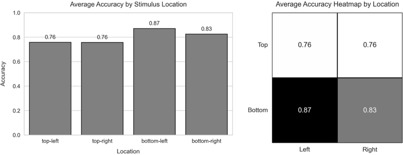 자극 제시 위치에 따른 평균 정확도는 하단 위치가 높은 정확도를 보였으며 그 중 좌하 위치에서 가장 높은 정확도(0.871), 우상 위치에서 가장 낮은 정확도(0.757)를 보였다(Table 2, Figure 6). Table 3의 분산분석(One-way ANOVA) 결과를 보면, 위치에 따른 효과가 유의수준 0.05에서 통계적으로 유의하였고(F=4.35, p=0.01), 사후검정을 수행하여 좌하와 좌상 간의 정확도 차이가 통계적으로 유의한 것을 확인하였다(p = .019).